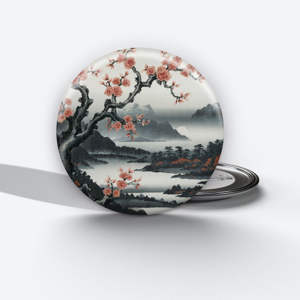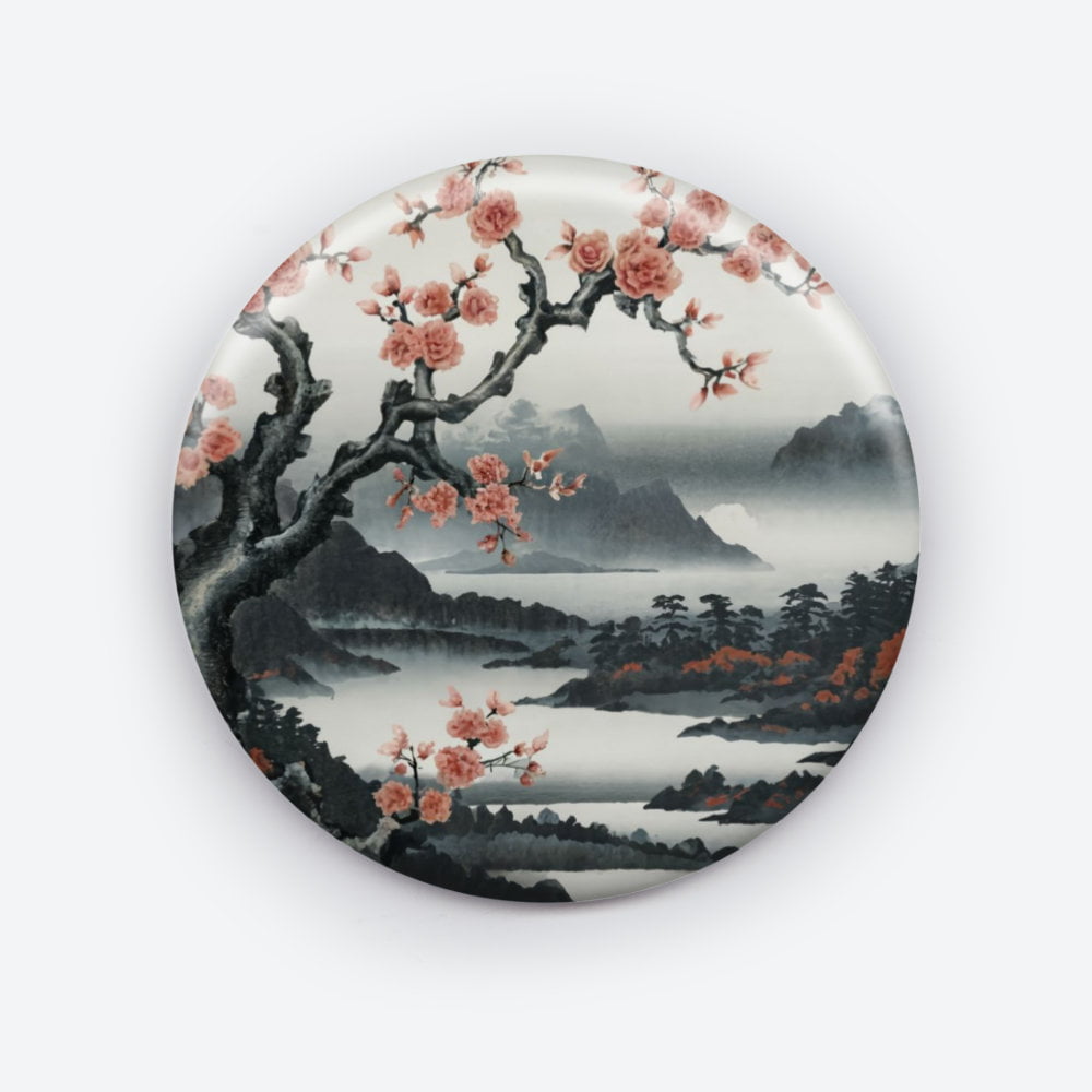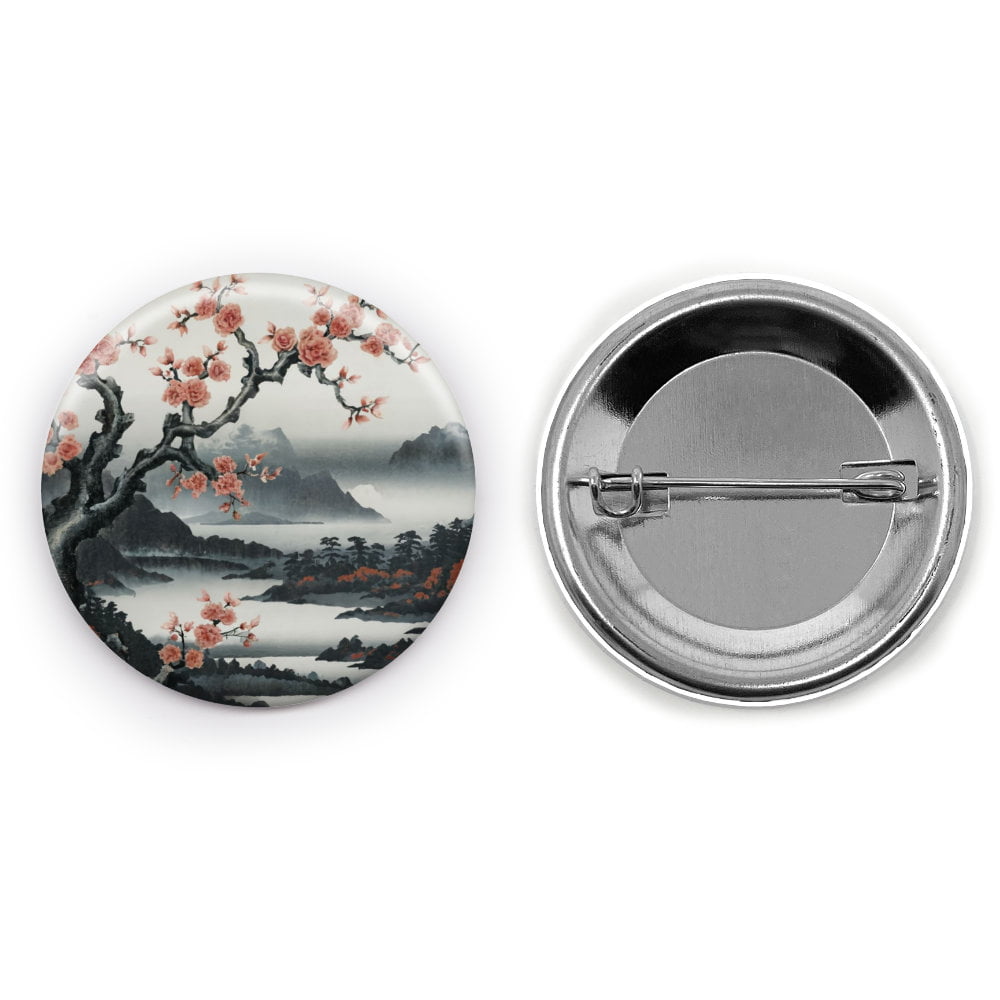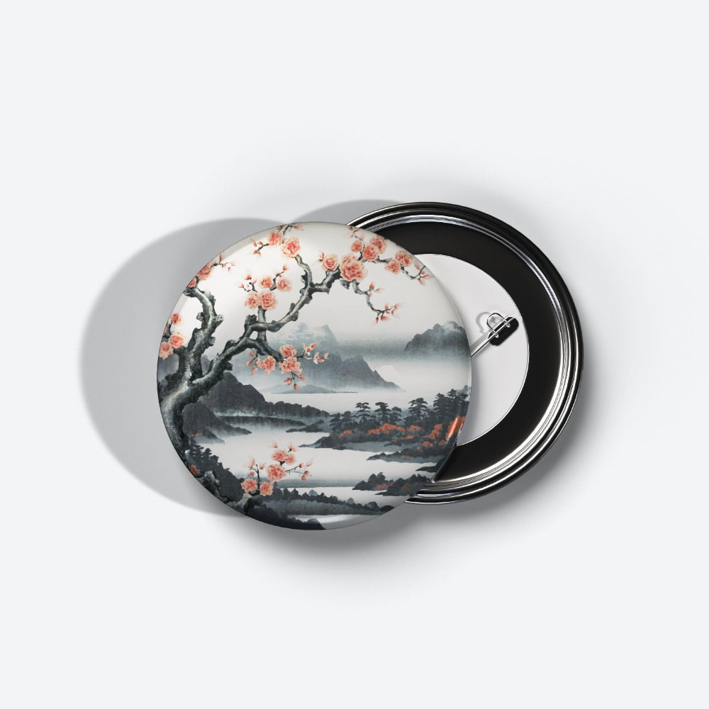 This Japanese art pin button features a stunning design inspired by traditional Japanese aesthetics.