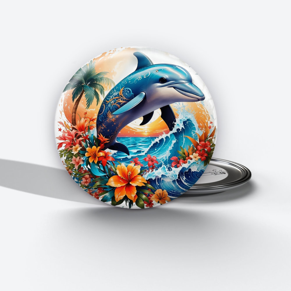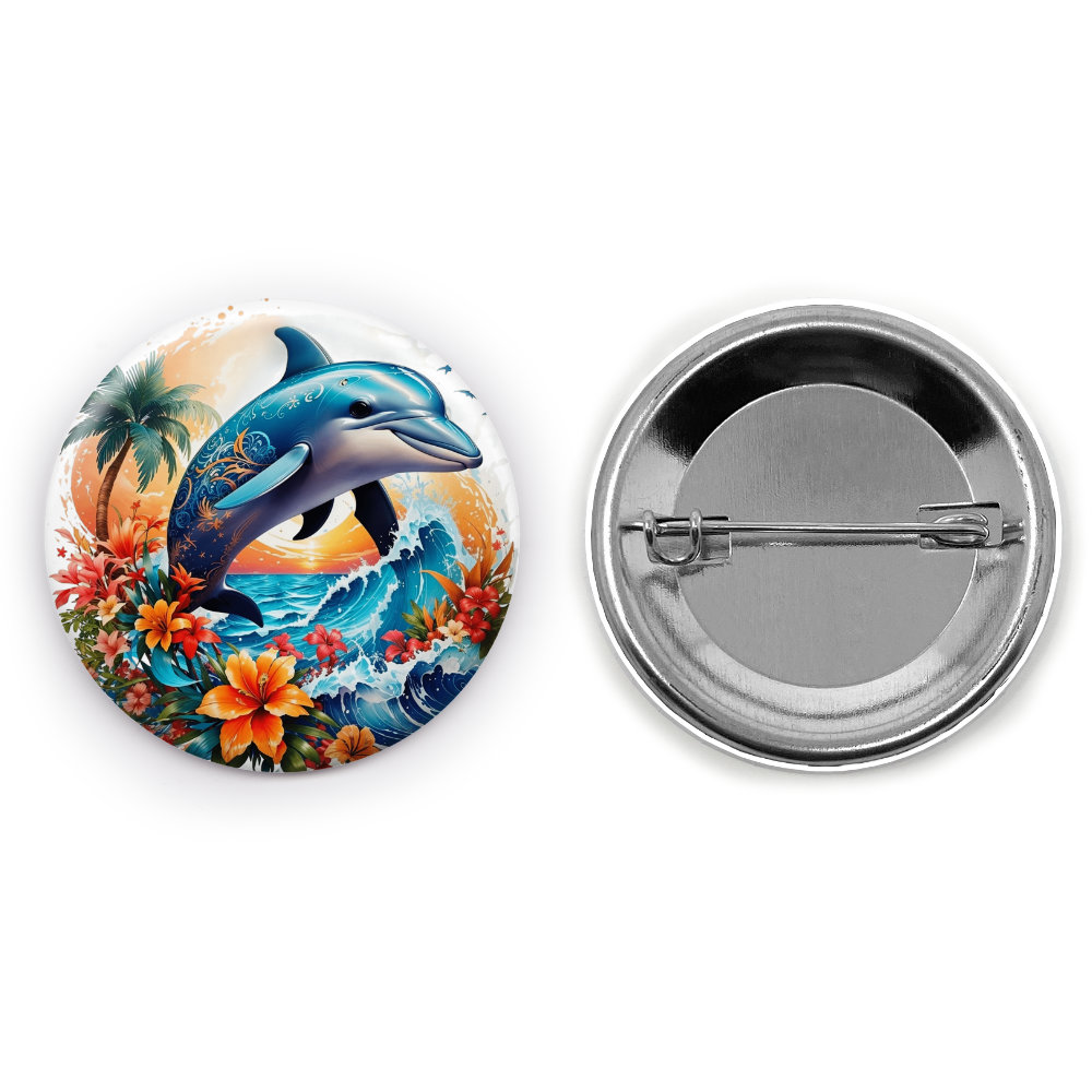 The Splash of Color dolphin pin button—Dive into a world of vibrant colors with this playful pin button featuring a beautifully designed dolphin.
